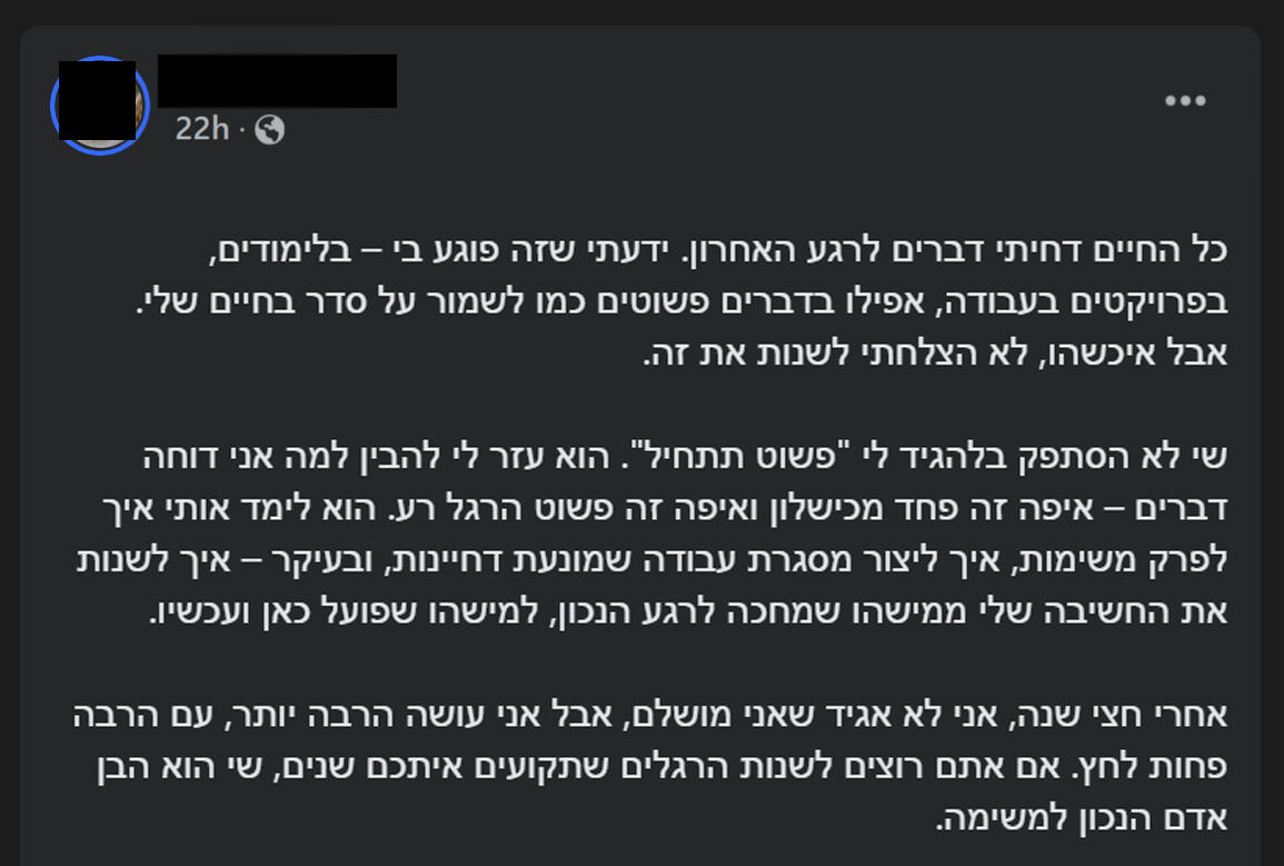 אימון אישי הוא תהליך התפתחותי המתמקד בחיבור בין הווה לעתיד רצוי. תבנית התהליך כוללת ארבעה שלבים שאותם עובר כל מתאמן.ת המצפה לתוצאות. לקוחותיי מגיעים להישגים משמעותיים בתחומים מגוונים - יציאה מתקיעות, שיפור יחסים בין-אישיים, התקדמות בקריירה, מציאת "סנטר", ריסון כעסים והתמודדות מקדמת עם אתגרי החיים השונים. ההתקדמות מתבטאת בתחושת מסוגלות גבוהה יותר, קבלת החלטות מושכלת, וחיים מאוזנים ומספקים יותר.